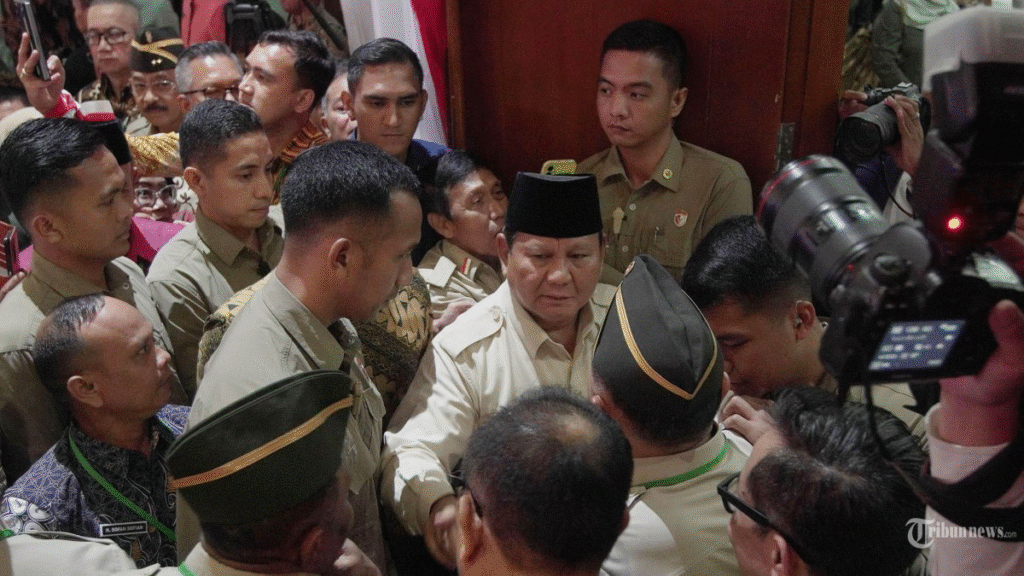 - Kompas.com (6 Mei 2025): Melaporkan bahwa Prabowo duduk semeja dengan Try Sutrisno dan menunjukkan gestur hormat sebelum berpidato, di tengah desakan pemakzulan Gibran.